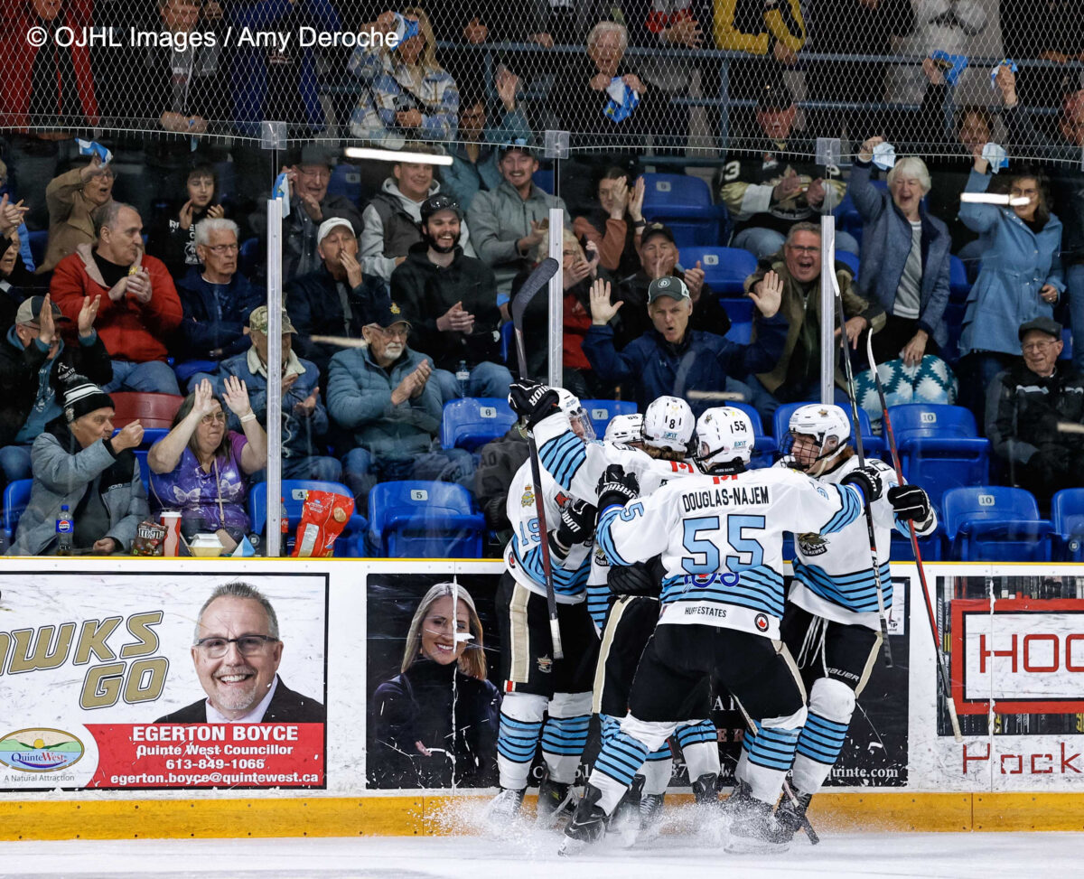 Trenton Golden Hawks and their fans celebrate during Game 3 of the Ontario Junior Hockey League Nutrafarms Championship Series in Trenton Monday night. The Golden Hawks won 5-4. (Photo by Amy Deroche/OJHL Images)