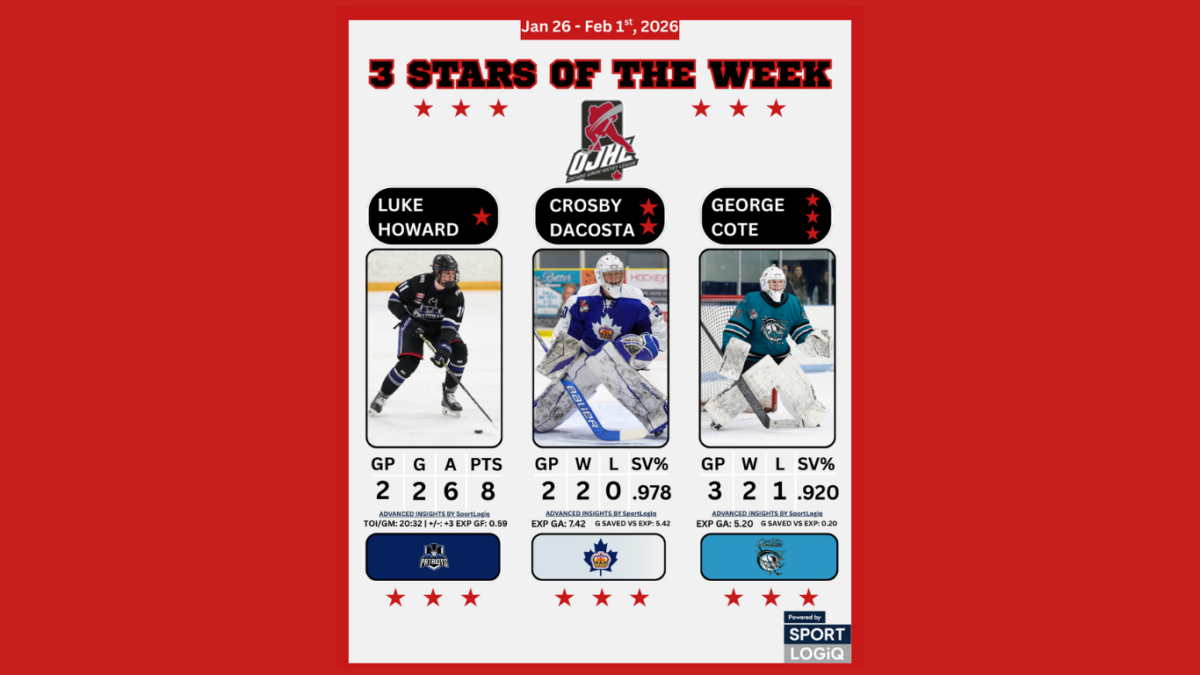 The 3 Stars of the Week are selected using statistics powered by SportsLogIQ and stats from the OJHL from the past week.