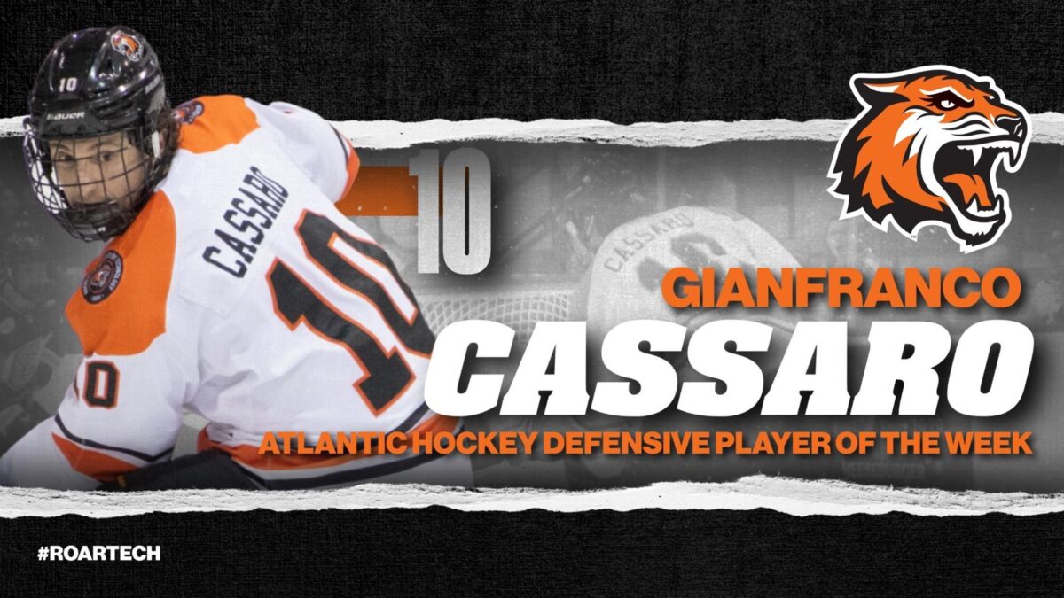 Cassaro totaled three points on a goal and two assists in RIT’s weekend sweep of Canisius as the Tigers clinched their second consecutive Robert DeGregorio Trophy and the top seed for the Atlantic Hockey postseason.